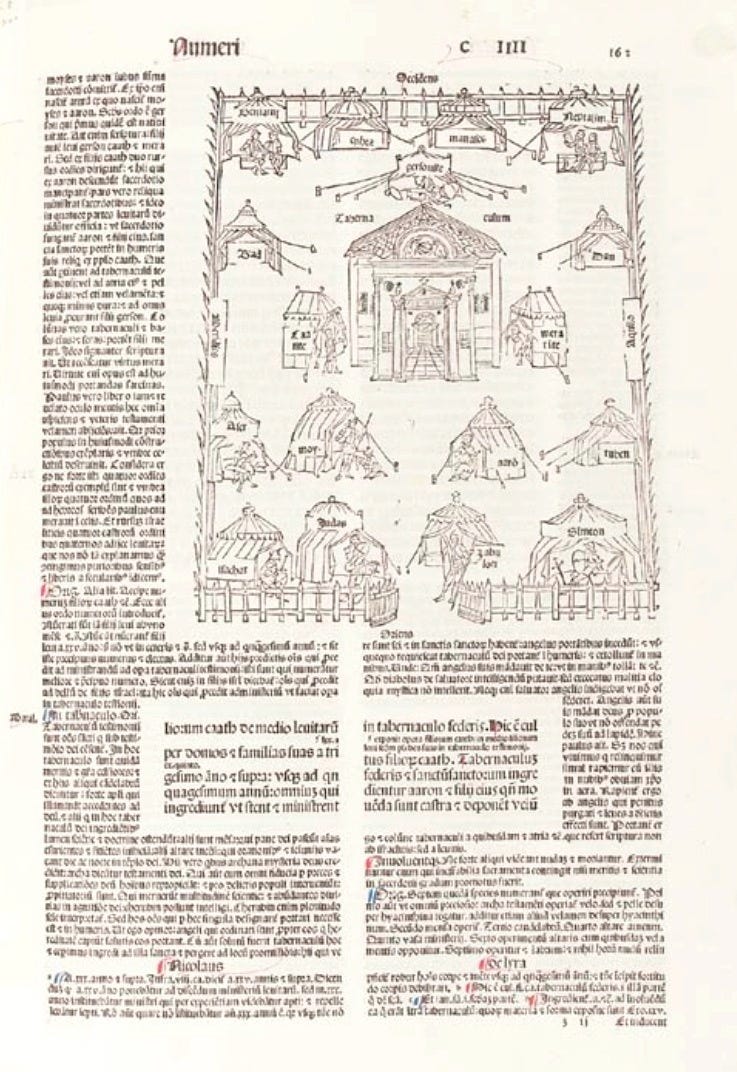 There is also a third form of glossa ordinaria, in which the gloss inserts itself between every line of the main text, creating Bibles with interlinear commentary, surrounded by more commentary. Here is a page from a Latin Bible published in 1495. In the middle is a passage from ther Book of Numbers, with small-print interlinear commentary, entirely surrounded by the glossa ordinaria. (And a picture of the Israelites’ tabernacles.)