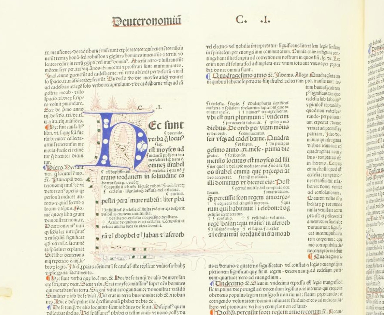 There are even passages where the interlinear commentary bursts its usual bounds, the way the painted ornamentation does. (On some pages, in some copies, the ornament makes use of the gutter all around the Biblical text, exactly like a vine growing between stones in a wall.) Here, at the opening of Deuteronomy, the smaller interlinear commentary sometimes overlows the end of the line and continues, after another line from Deuteronomy, forming a separate text flowing between the lines of the Biblical text.